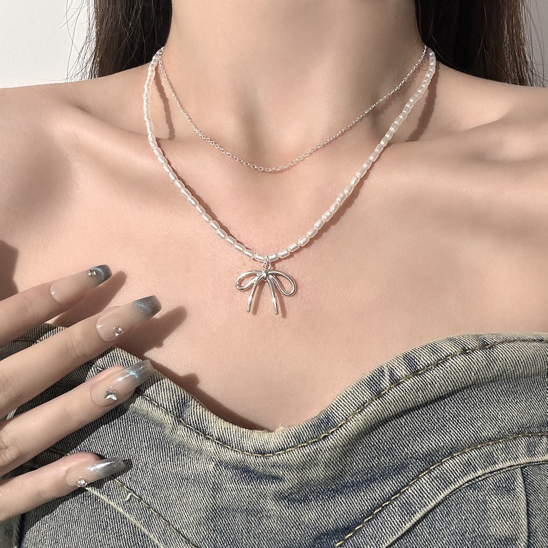 Pearl Bow Pendant Necklace Women's Light Luxury Niche All-match Elegant Fashion Neck Chain Stacked Collarbone Chain Collar