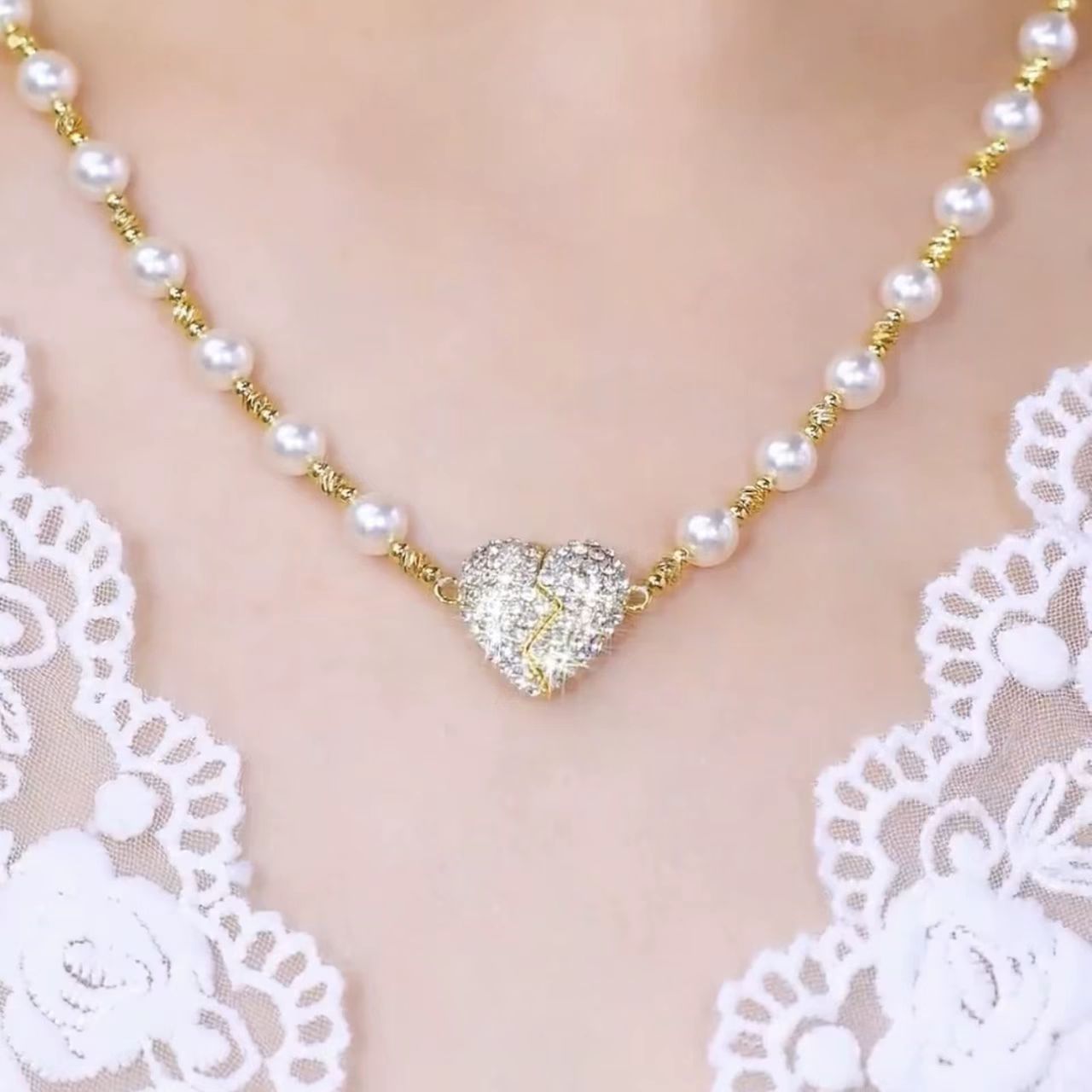 High-End Diamond-Encrusted Heart-Shaped Magnetic Pendant Pearl Necklace, Light Luxury Niche Design, Versatile Elegant Clavicle Chain