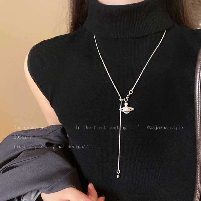 Saturn pearl pendant tassel necklace 2024 new autumn and winter cold wind temperament niche fashion clavicle chain