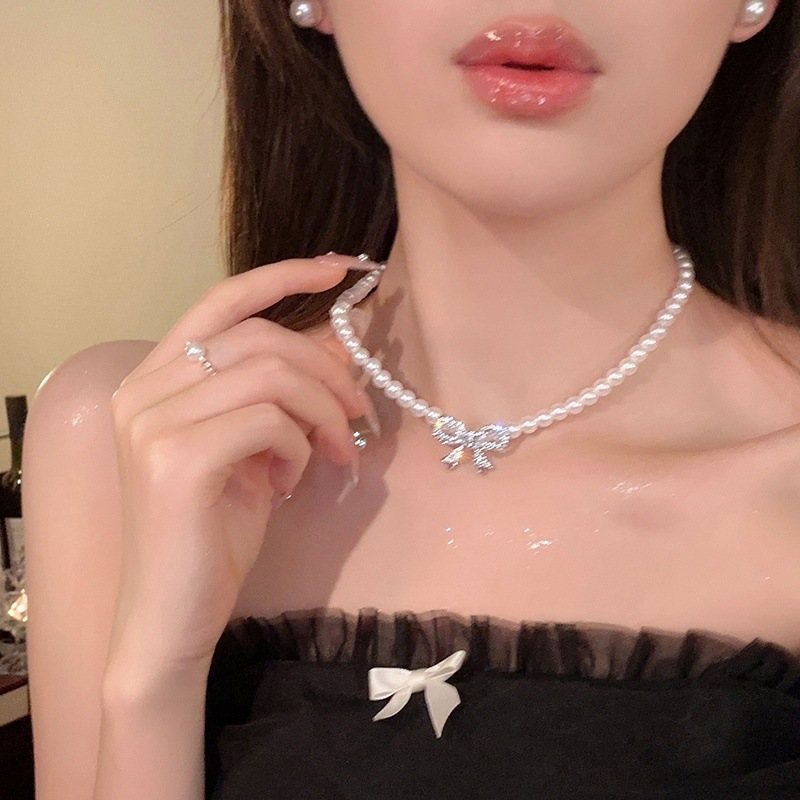 French Retro Imitation Pearl Diamond Bow Necklace Cyber Celebrity Super Fairy Temperament Necklace Clavicle Chain Design Necklace