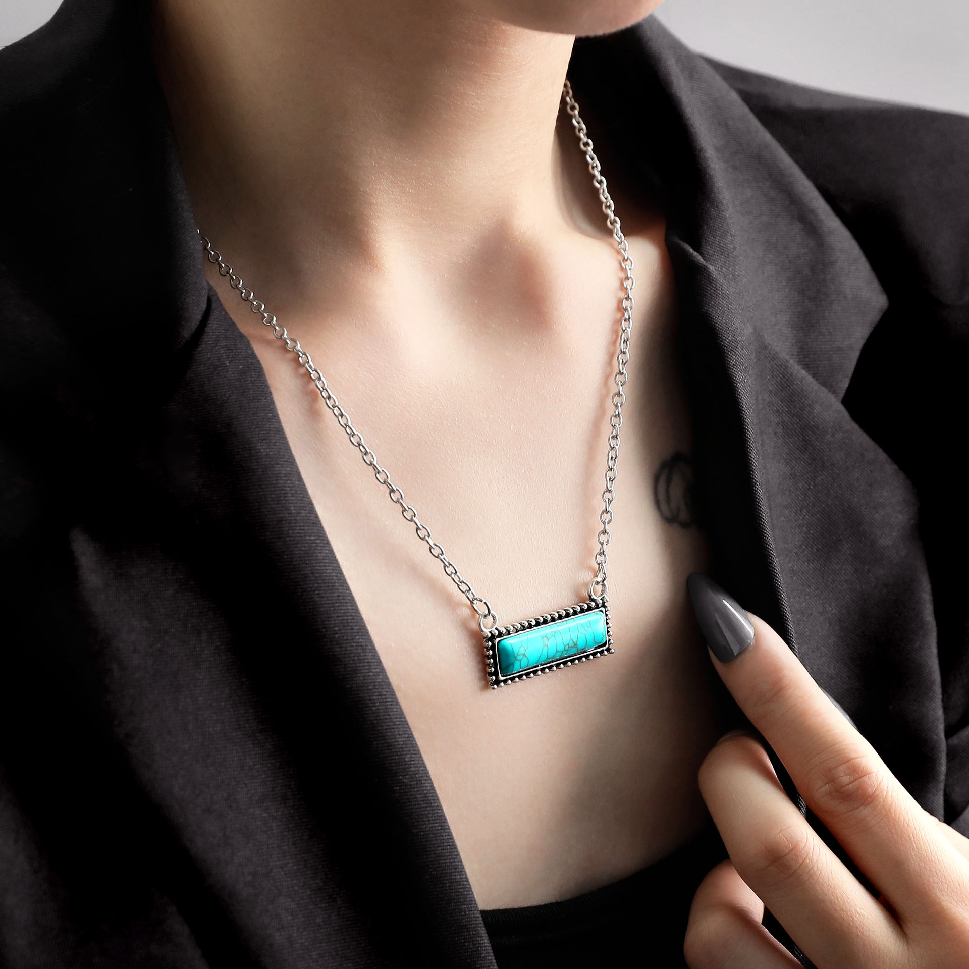 Cross-Border Export New European and American Necklaces Retro Ethnic Style Rectangular Turquoise Pendant Alloy Necklace Jewelry