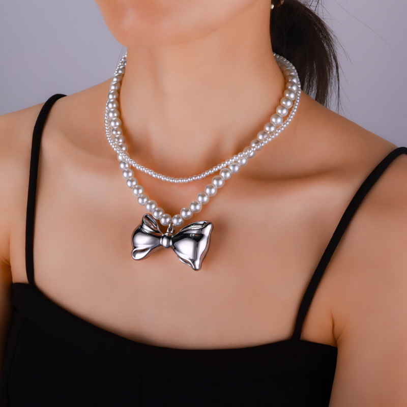 New Style South Korea Dongdaemun Elegant Large Bow Necklace Women's Internet Celebrity Ins Style Pearl Double-Layer Clavicle Chain Trendy