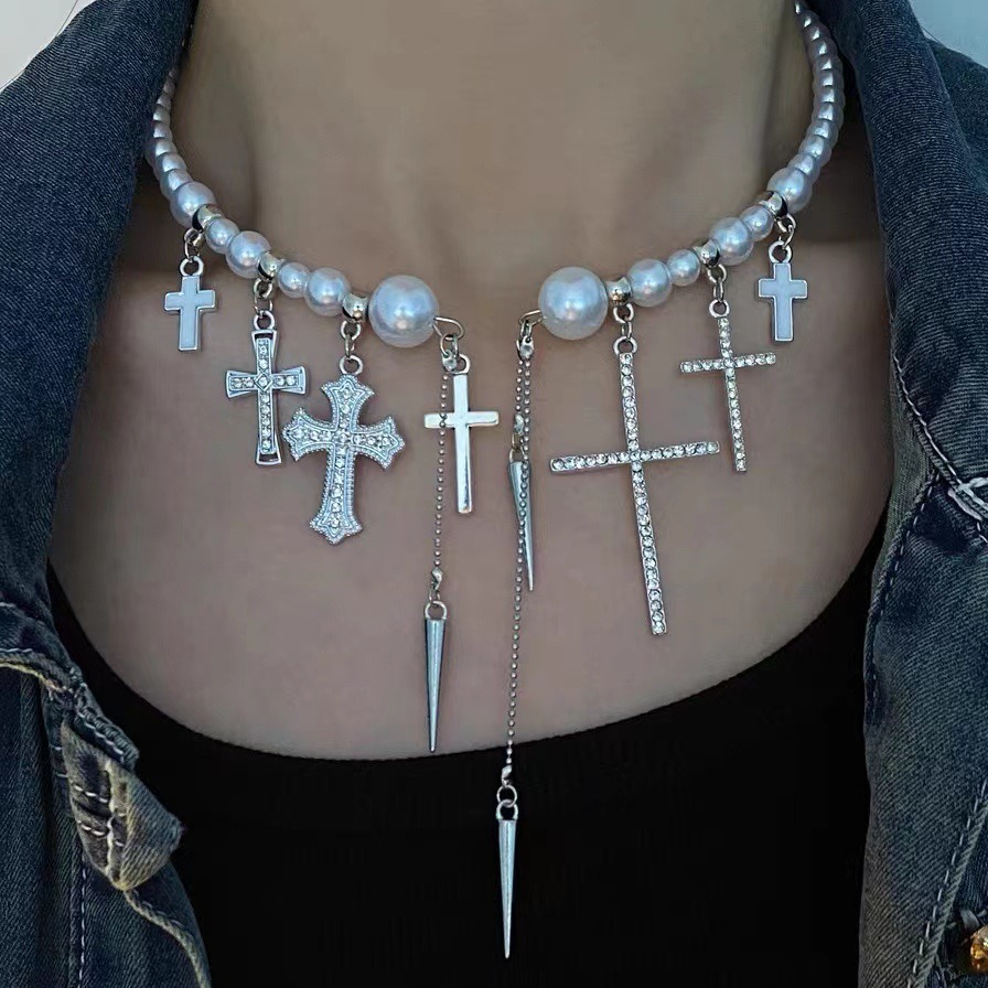 Sweet and Cool High-end Versatile Open Pearl Cross Rivet Tassel Necklace Trendyy Accessible Luxury Neck Chain Clavicle Chain Jewelry