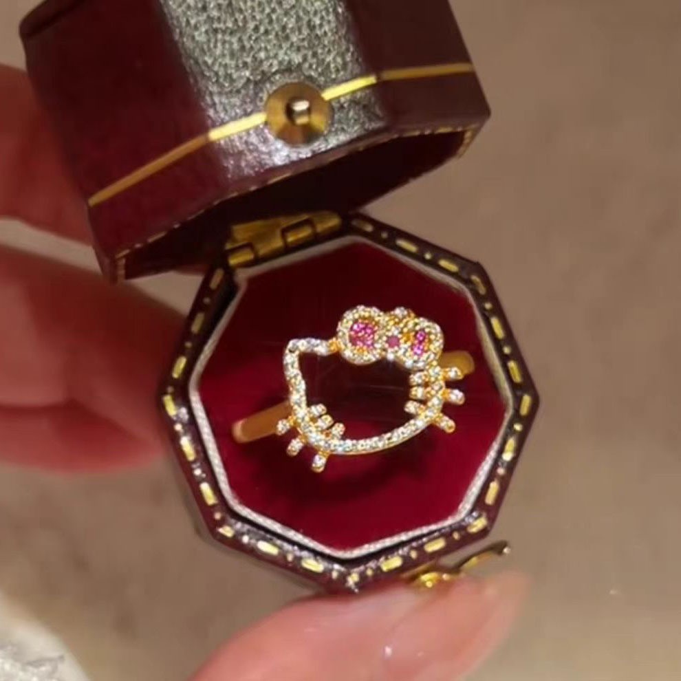 Xiaohongshu's Popular Golden Full Diamond Cut Out Kt Cat Ring Female Niche Cute Cartoon Sweet High-Looking Index Finger Ring