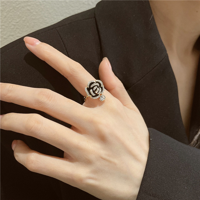 New personality retro fashion temperament jewelry with rhinestone black flower opening drop ring camellia ring