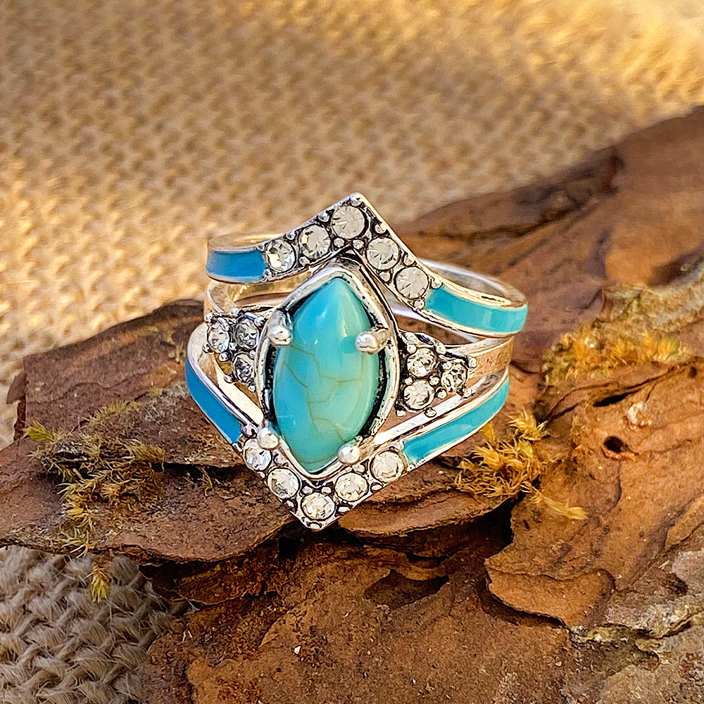 wish New Jewelry European and American Cross-border ins Creative Retro Turquoise Set with Diamond Three-piece Set Women's Set Ring