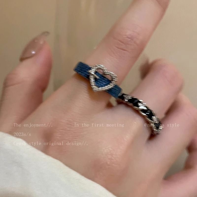 Denim Leather Heart Ring for Women, Autumn and Winter Vintage Student Versatile Adjustable Open Index Finger Ring Tail Ring Trendy