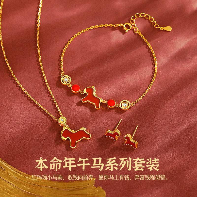 Tich Original Get Rich Necklace Women's S925 Sterling Silver Retro Zodiac Year Bracelet Red Agate Zodiac Horse Stud Earrings