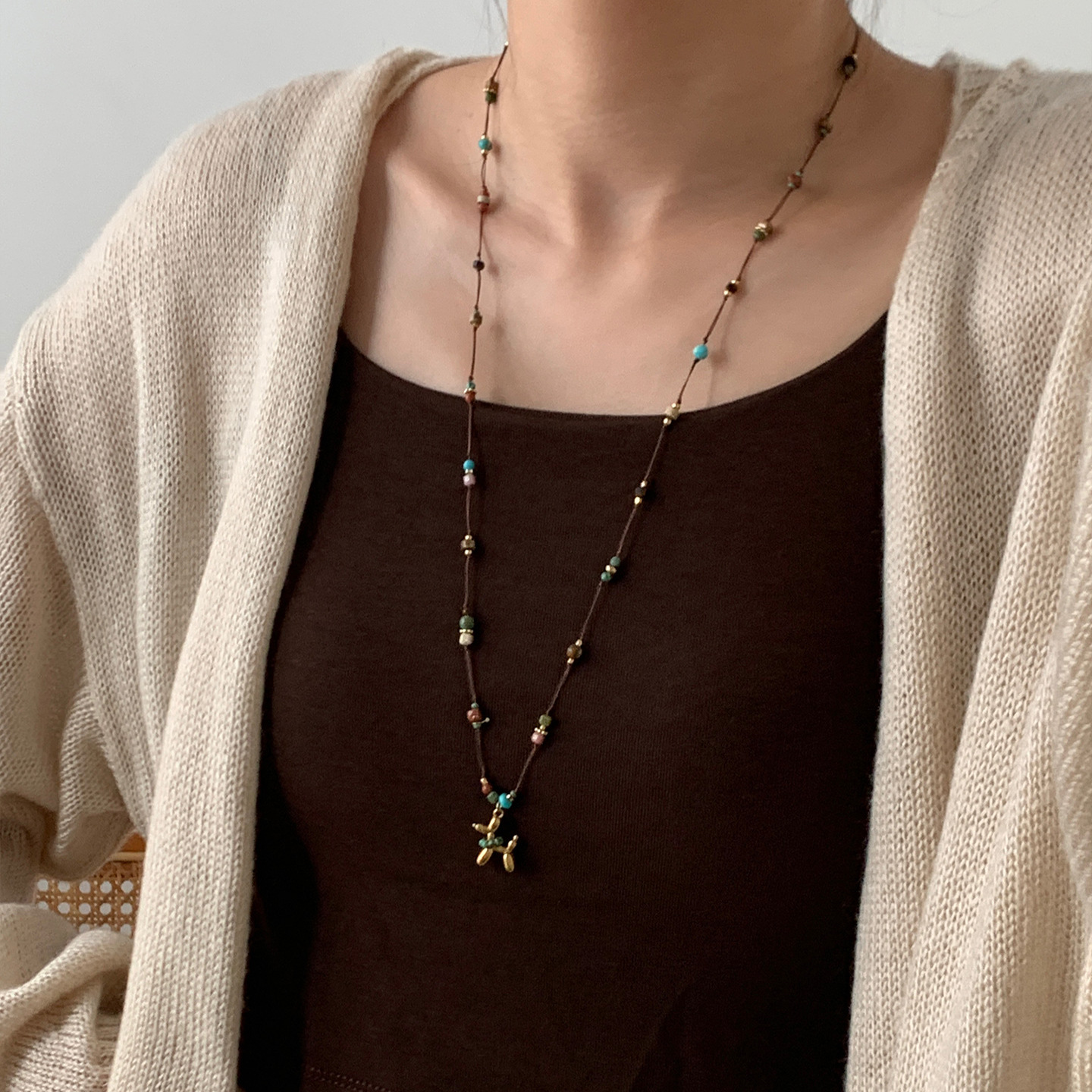 New Chinese Style Natural Stone Balloon Puppy Braided Necklace Maillard Handmade Beaded Sweater Chain Female Niche Design