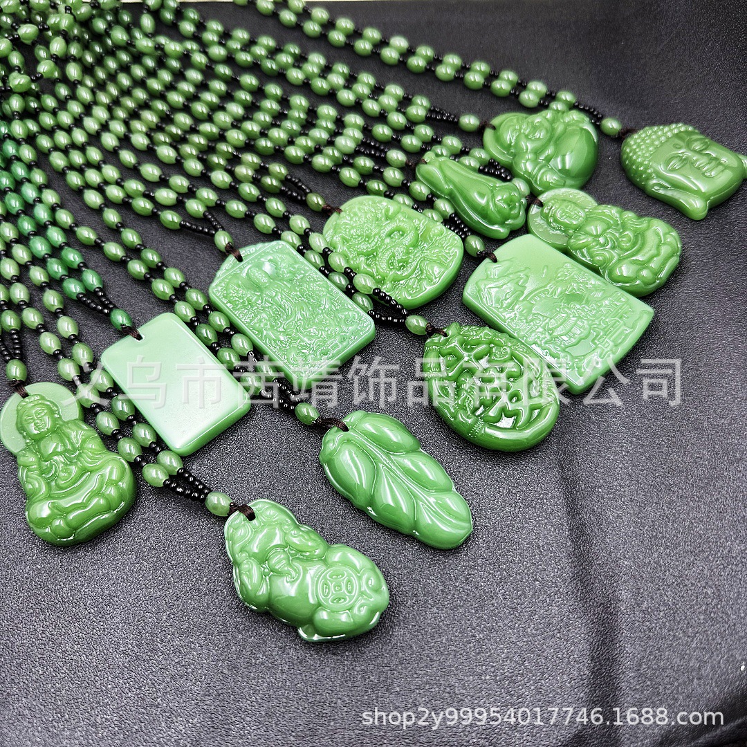 Live High Imitation Spinach Green Dragon Brand Necklace Rice Bead Chain Men and Women Buddha Guanyin Pendant Dark Green Jade Color No Matter Brand Pendant