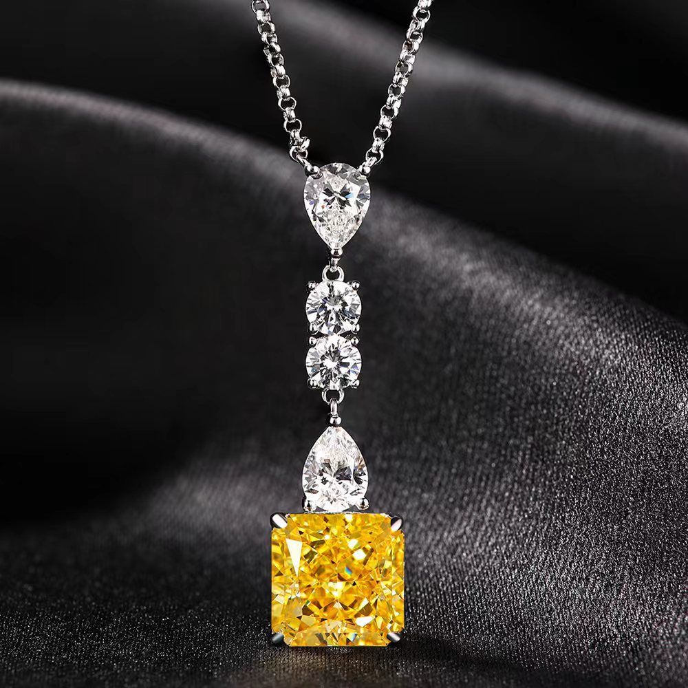 Cross-Border S925 Silver Ice Flower Yellow Diamond Necklace, Simple and Minimalist Style, Long High-Carbon Diamond Pendant Clavicle Chain for Women, Square-Shaped