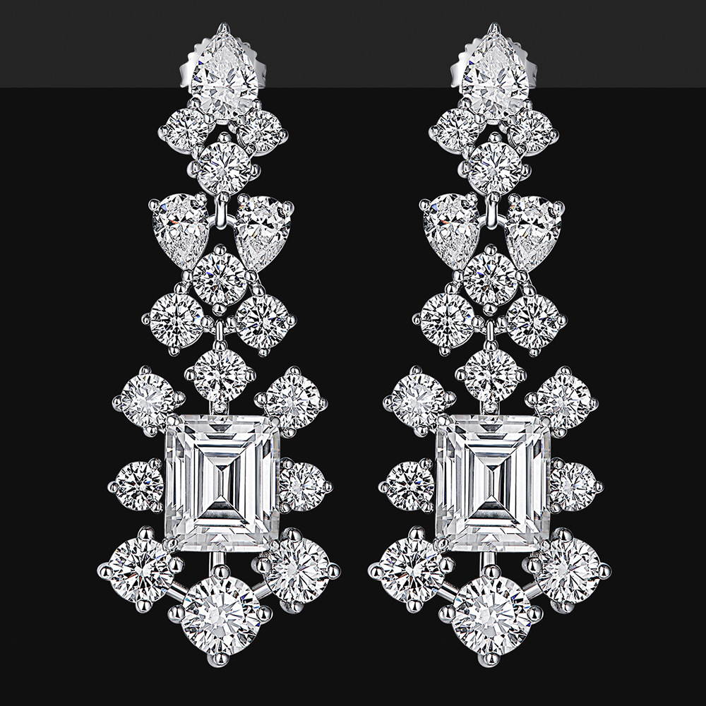 Cross-border Hot Sale S925 Silver Rectangle White Diamond Earrings Light Luxury High-end Ice Flower Cut High Carbon Diamond Earrings Tassel Earrings