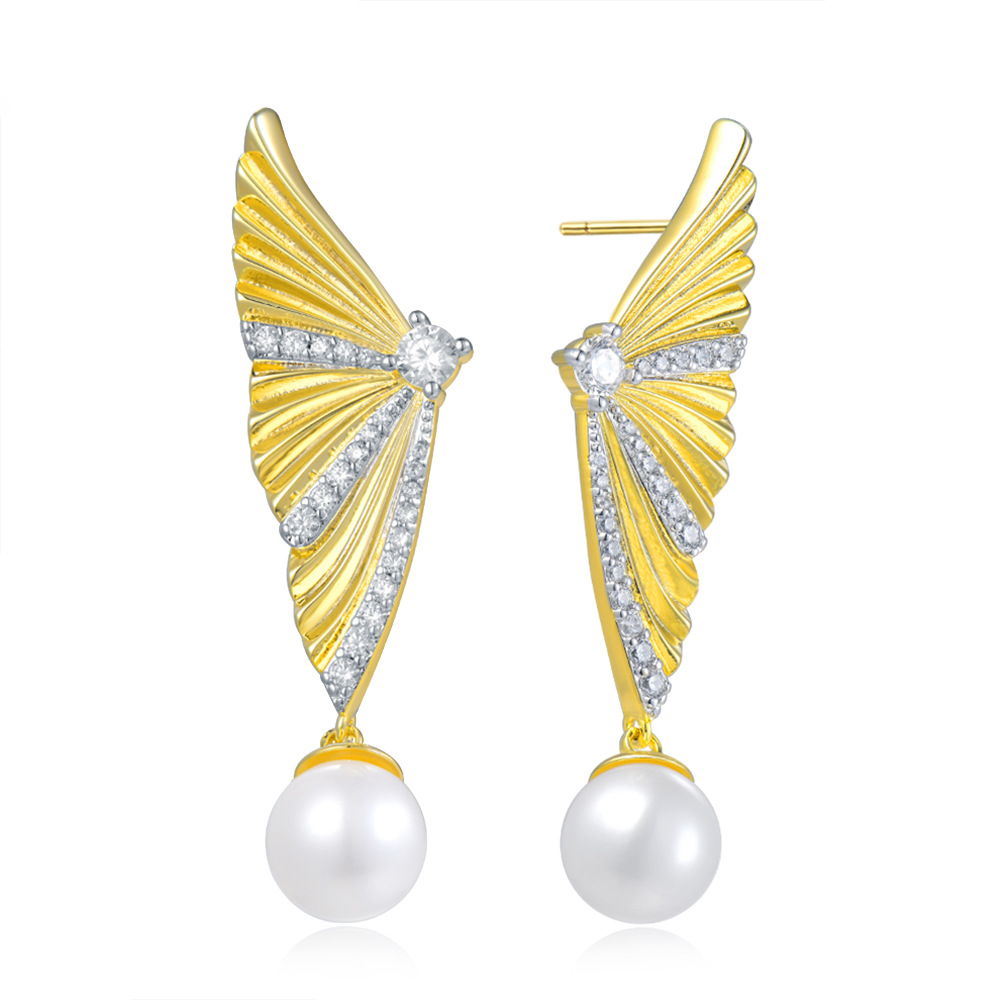 European and American Cross-border S925 Sterling Silver Butterfly Wings Earrings Plated 18K Gold Diamond 5A Zircon Ginkgo Leaf Pearl Earrings