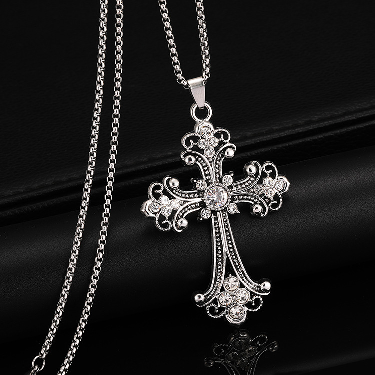2025 Spring New Baroque Style Cross Necklace European and American Hip-Hop Pendant Sweater Chain Accessory Trendy with Rhinestones