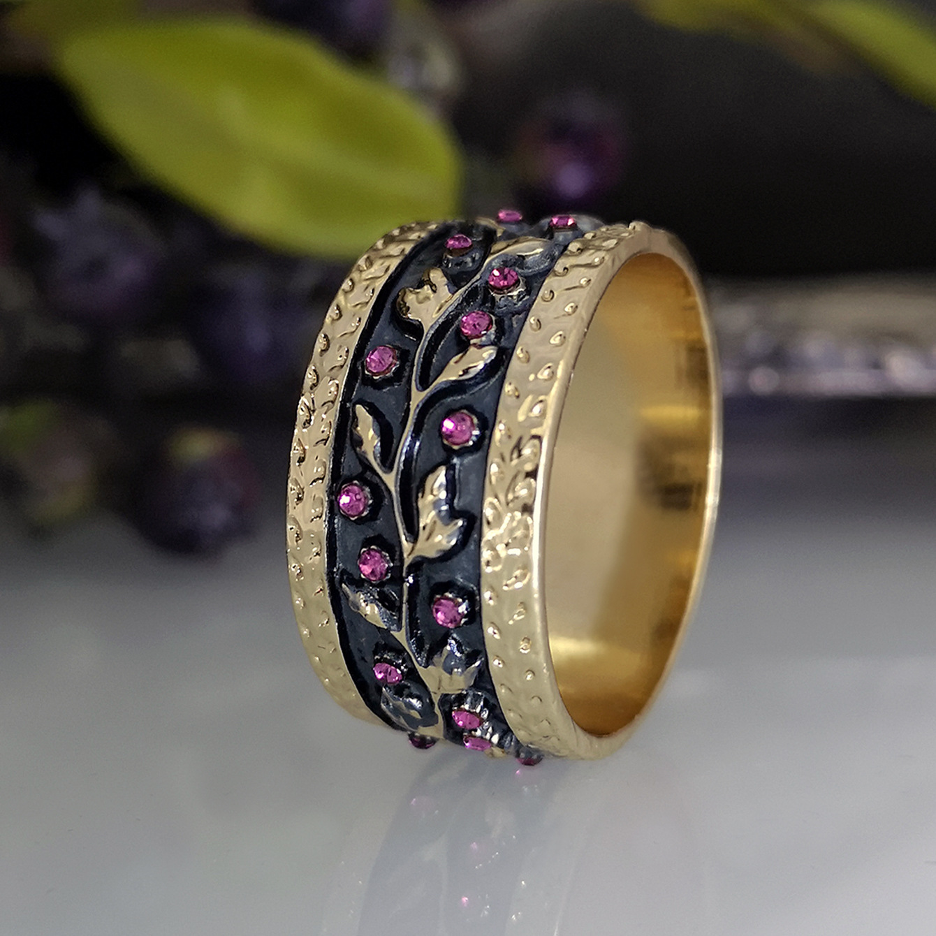 Rongyu Craftsman Creative Vine Branches and Leaves Inlaid Rhododendron Stone Ring European and American Vintage Carved Handmade Enamel Finger Ring
