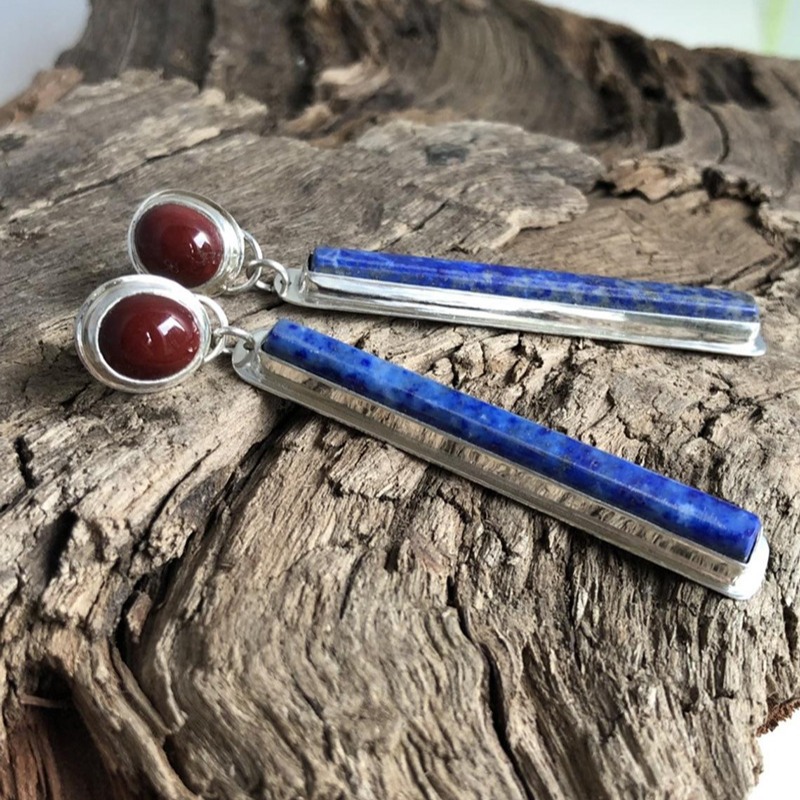 Rongyu Artisan handmade red agate and lapis lazuli earrings European and American retro 925 long vertical earrings