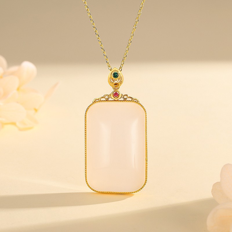 S925 Silver Inlaid Natural Gold Silk Jade Peace Pendant Necklace Retro Design Clavicle Chain Wholesale