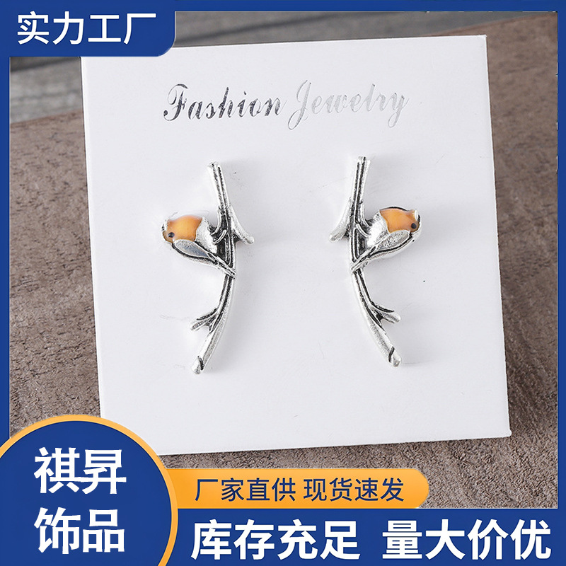 European and American Retro Oil Dropping Bird Branch Earrings Ring Necklace Niche Simple Animal All-match Alloy Jewelry