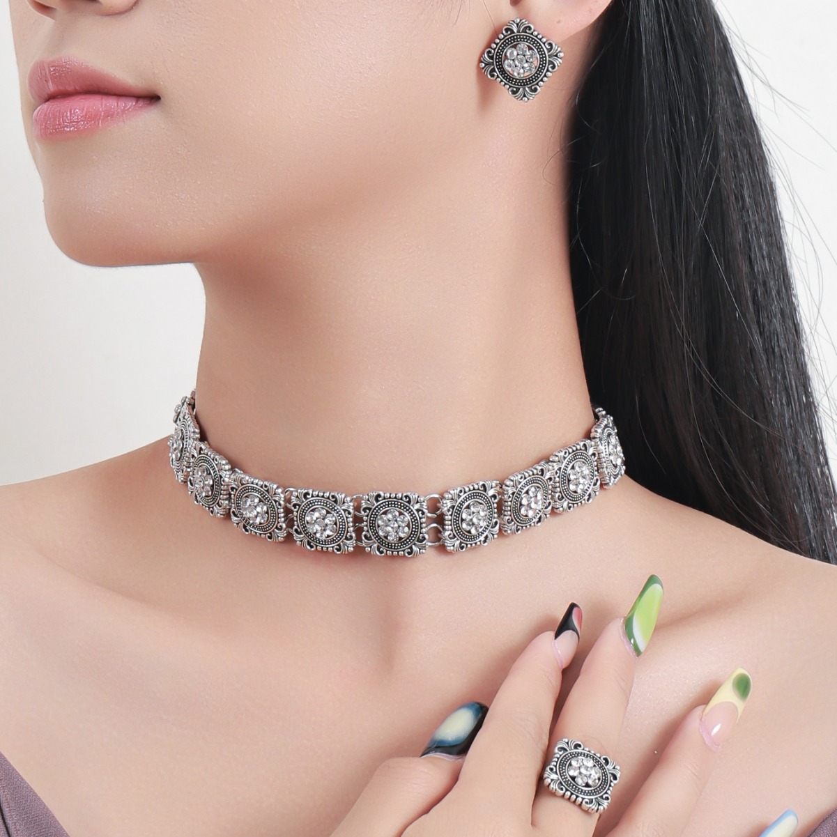 Cross-border retro diamond-encrusted flower geometric square gem necklace European and American court necklace earrings ring three-piece suit