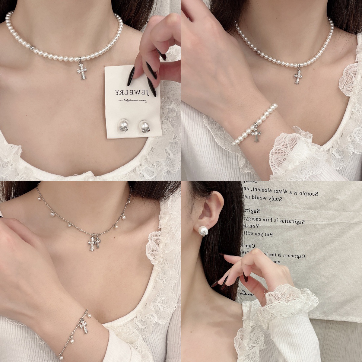 European and American style pearl cross necklace earring bracelet pearl cross embellishment bracelet clavicle chain exquisite fashion personality