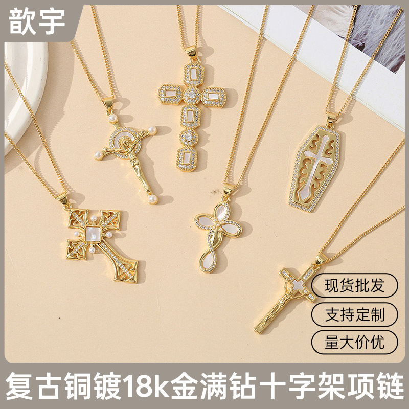 Cross-Border Retro Copper Plated 18K Gold Full Diamond Cross Necklace Pendant Zircon Necklace Natural Shell Jewelry Wholesale