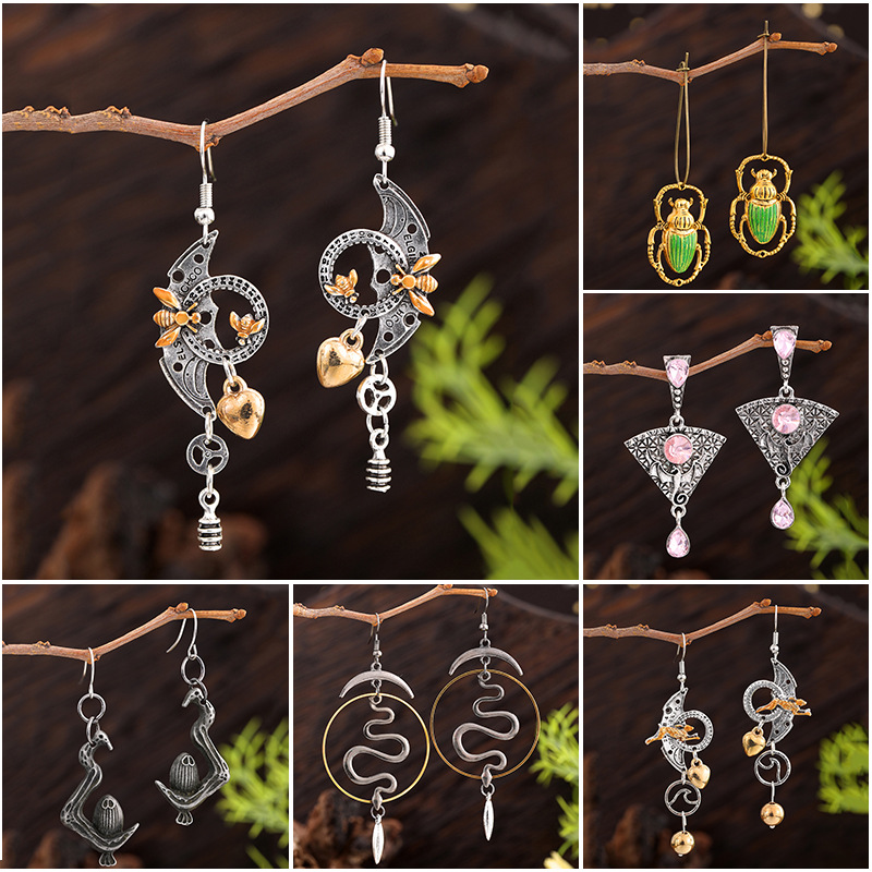 Mechanical Wind Geometric Crescent Golden Bee Distinctive Earrings Cross-border Hot Selling Hand-painted Oil Long Earrings Jewelry