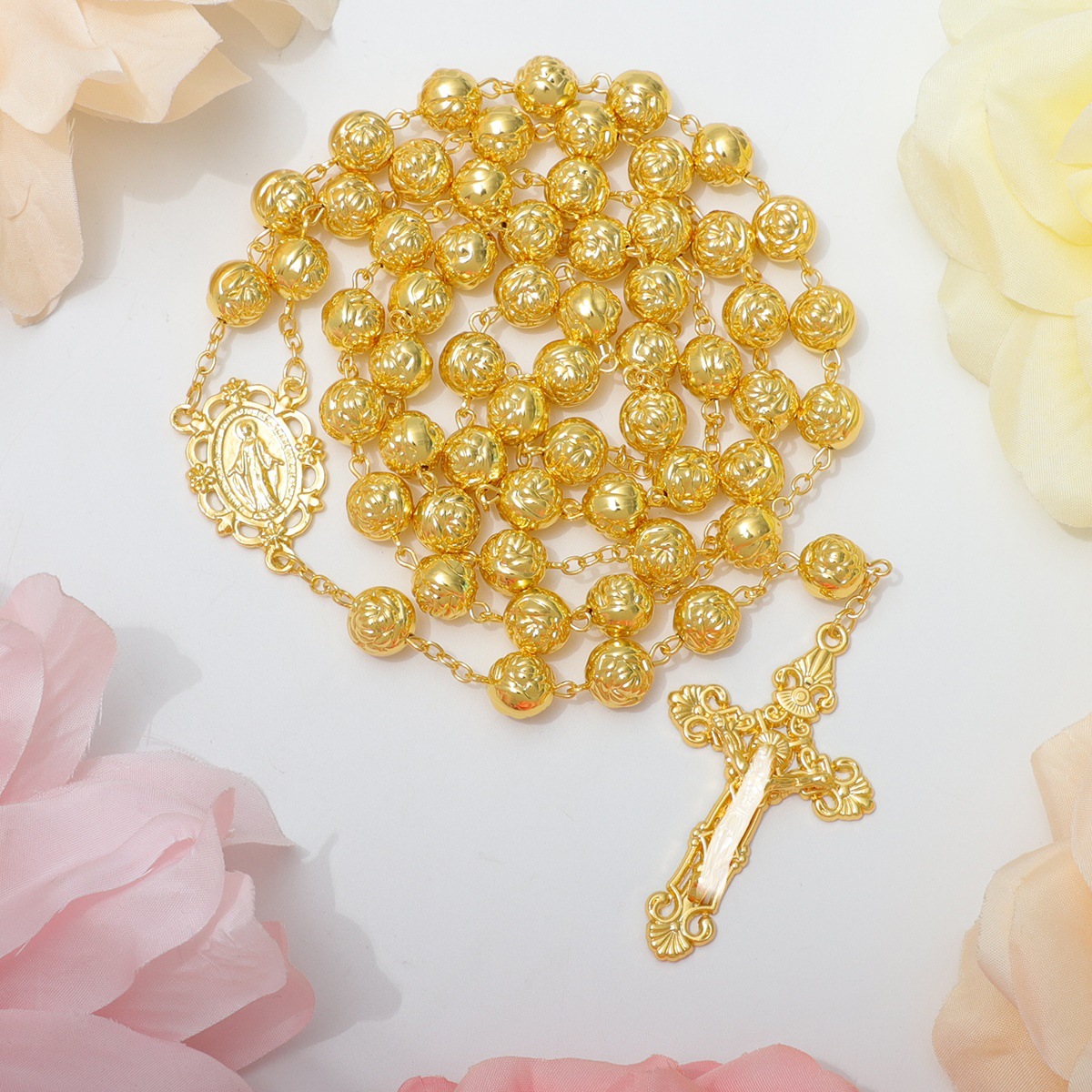 Amazon's Best-Selling Golden Fashion 10mm Rose Bead Cross Necklace Pendant Retro Handmade Beaded Rosary Supply