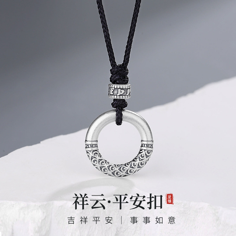 Tiqia Real Shot Sterling Silver 999 Safety Buckle Necklace Men's Ethnic Style Retro Auspicious Cloud Pendant Braided Necklace Trendy