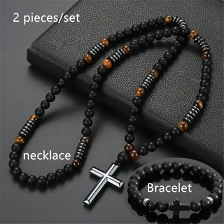 Cross-Border Retro Tiger Eye Beaded Necklace Cross Pendant Long Bead Chain Men's and Women's Accessories Fashion Trend Sweater Chain