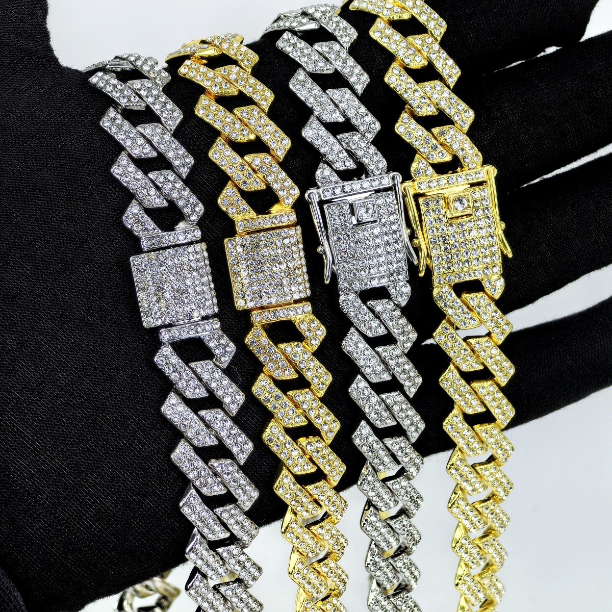 New European and American Cuban Chain New 15mm Rhombus Flip Full Diamond Hip-Hop Style Bracelet Necklace Large Gold Chain Cross-Border