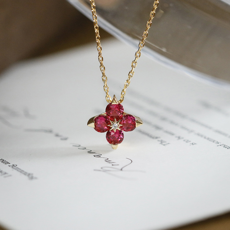 Dunli Jewelry [Guardian Stone] Four-Leaf Clover Design Light Luxury Style S925 Silver Gold-Plated Red Corundum Necklace