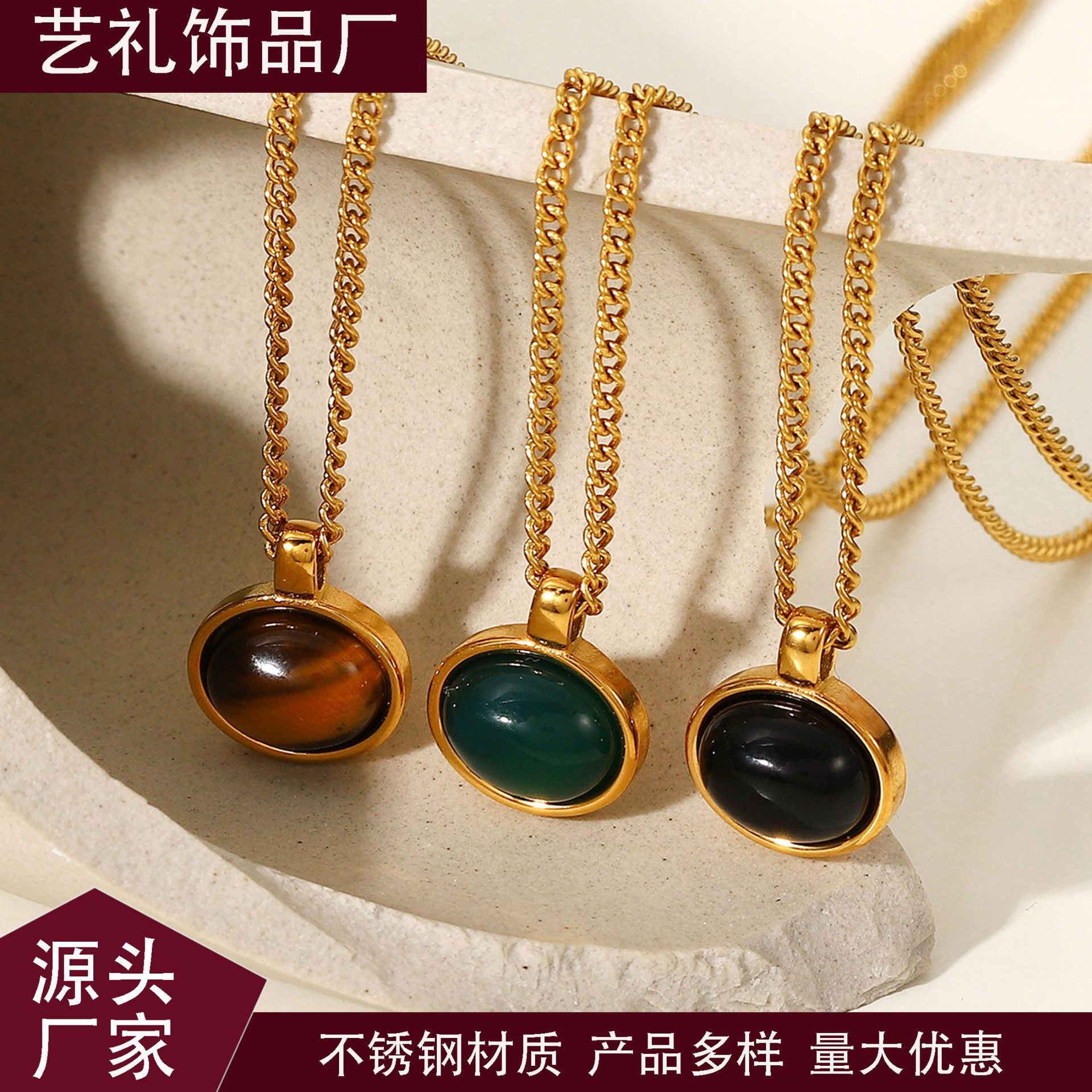 European and American Style New Fashion Oval Tiger Eye Stone Black Agate Green Agate Titanium Steel Plated 18K Gold Pendant Necklace