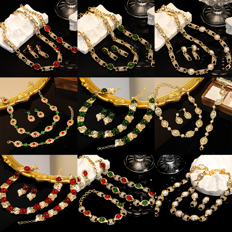 Middle Ancient vintage Vintage Elegant Jewelry suit Court Style Inlaid Earrings Necklace Luxury Elegant Three-piece Set