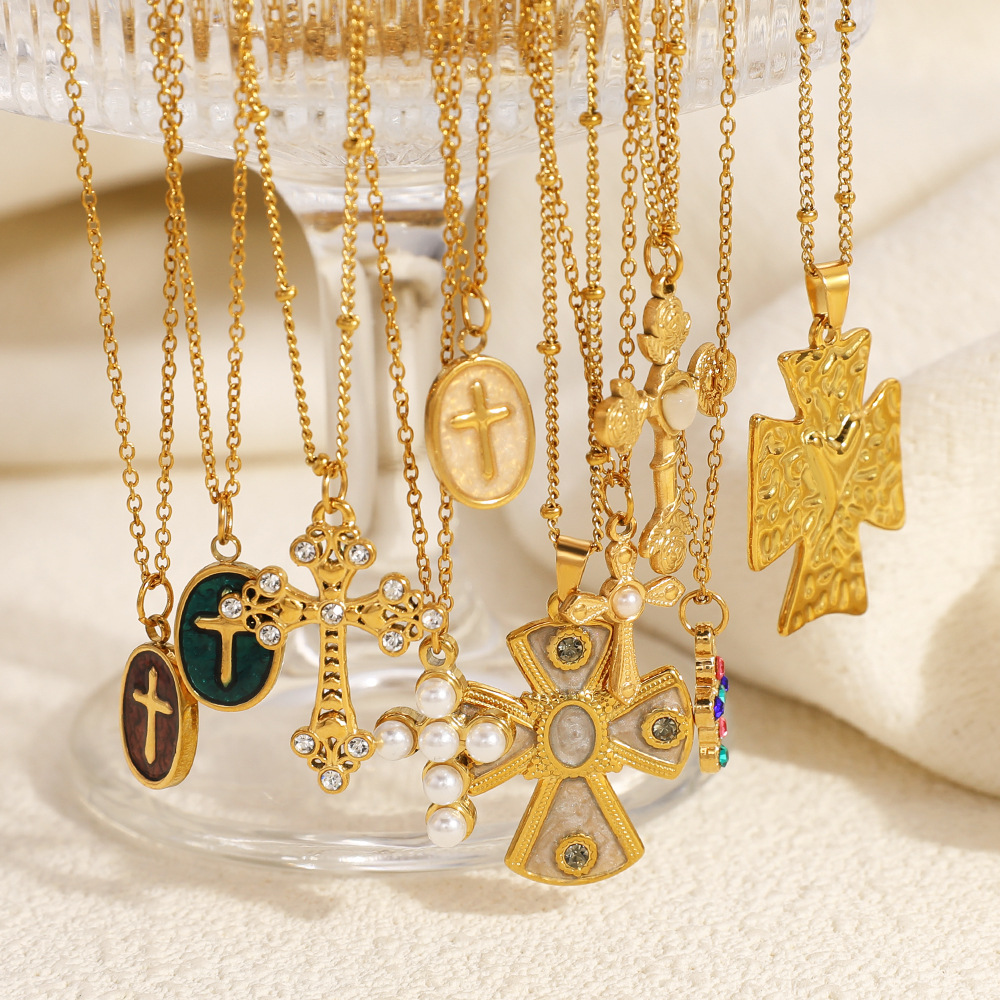 Cross-Border Hot-Selling Stainless Steel Necklace, Artistic Retro Maillard Style Cross Pearl Plated 18K Gold Color-Preserving Necklace