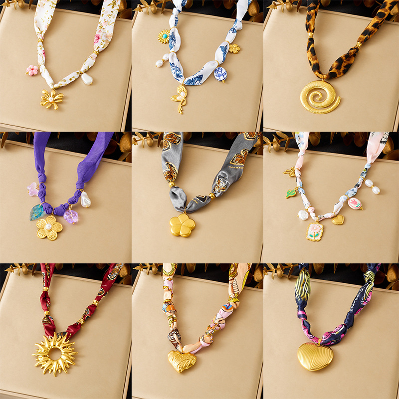 Fashion Retro Printed Ribbon Chain Leopard Print Small Floral Oil Drop Square Spiral Gold-Plated Pendant Jewelry Necklace