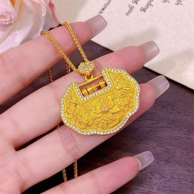 Gold Shop Same Style Sand Gold Inlaid Diamond Flower Blooming Wealth and Good Fortune Lock Necklace DIY Accessories Hanfu Accessories Pendant Sweater Chain