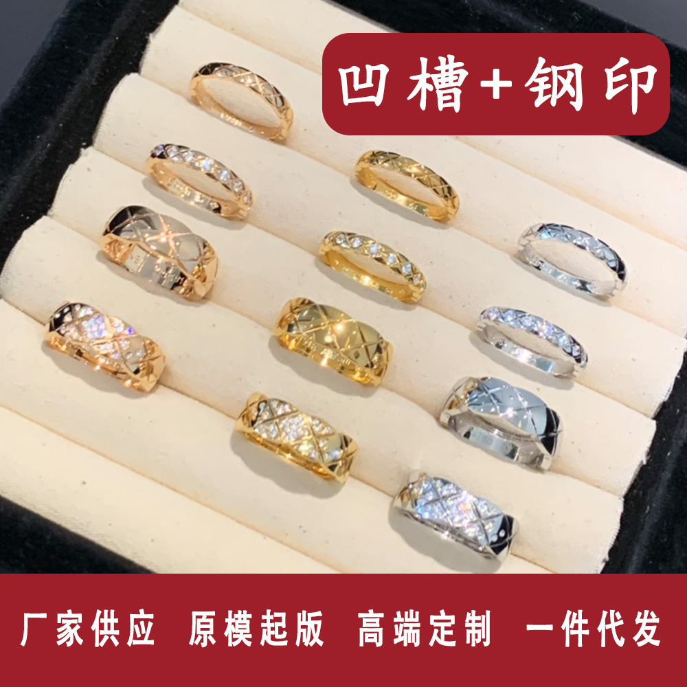 Xiangjia Coco Quilted Pattern Ring Titanium Steel Silver-Plated High Version Narrow Version Wide Version Diamond-Free Ring Cnc Finely Carved Hand Ornaments