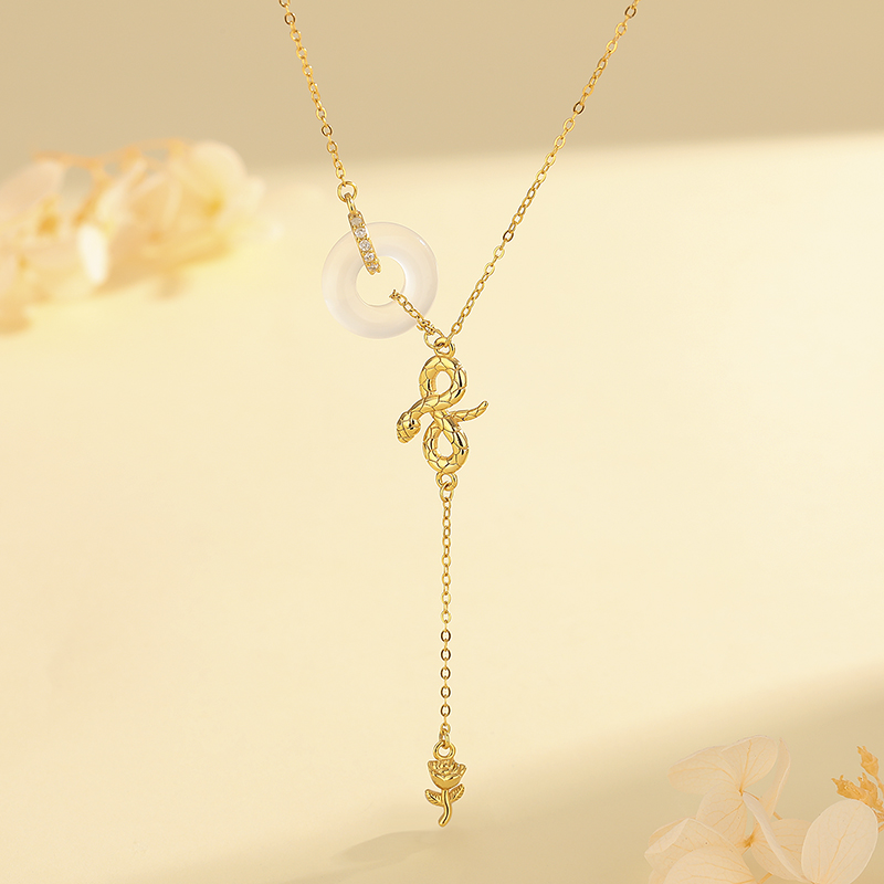 Elegant Rose Flower Snake Necklace with New Chinese-Style Tassels, Long Safety Buckle, Chalcedony Pendant, Auspicious and Exquisite Accessory