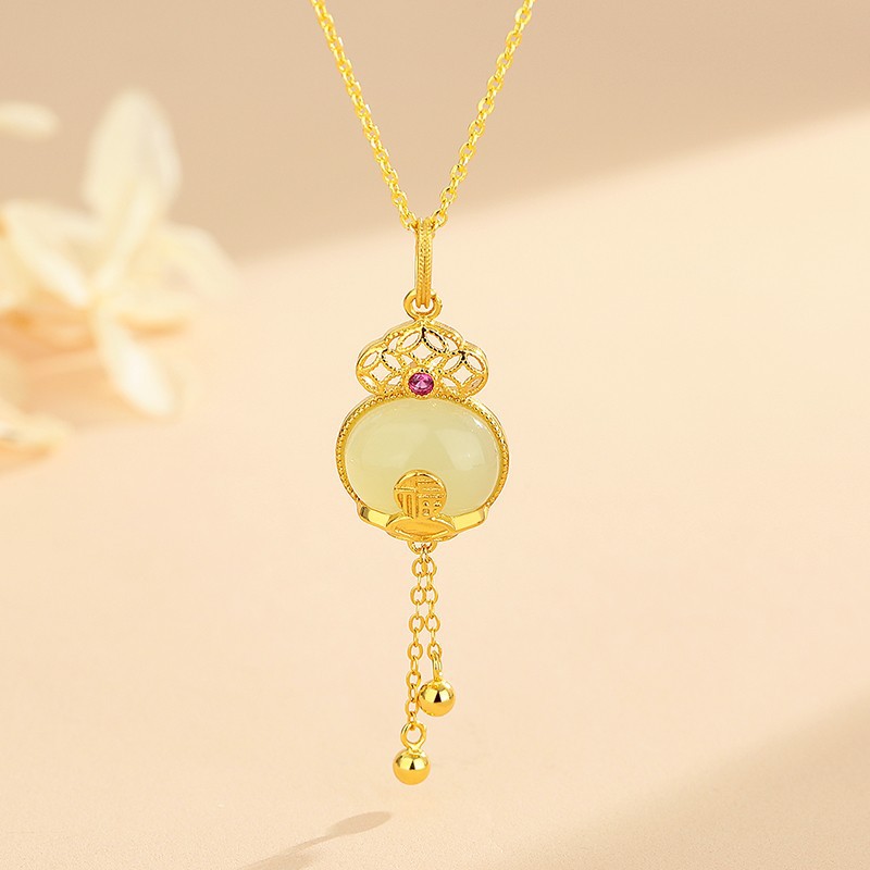 Silver S925 Sterling Silver Gold-Plated Hetian Jade National Trend Gourd Auspicious Cloud Blessing Tassel Pendant Women's Necklace Accessible Luxury