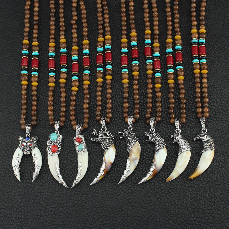 Vintage Ethnic Style Domineering Spike Pendant Necklace Wooden Beads Sweater Chain Pendant Personality All-match Accessories