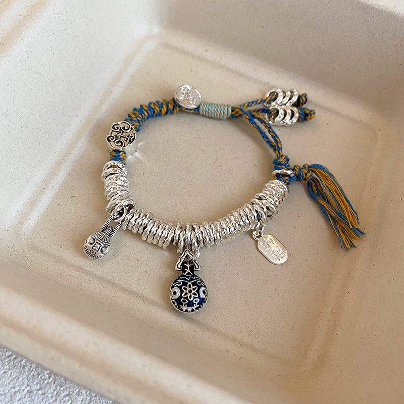 Ancient Gold-Swallowing Beast Silver Bracelet for Women, Ethnic Style Blue and White Porcelain Braided Bracelet, Niche Accessible Luxury Wealth-Bringing Bracelet Jewelry