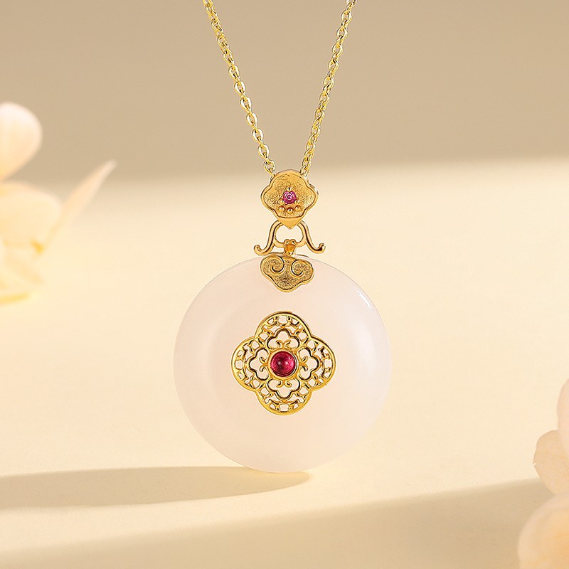 S925 Sterling Silver Inlaid Gold Silk Jade White Jade Safety Buckle Pendant Wholesale Couple Jade Pendant Necklace