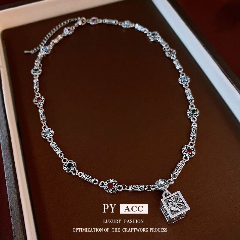 Cross-border diamond square flower necklace in the ancient minority Joker sweater chain high sense retro temperament jewelry wholesale