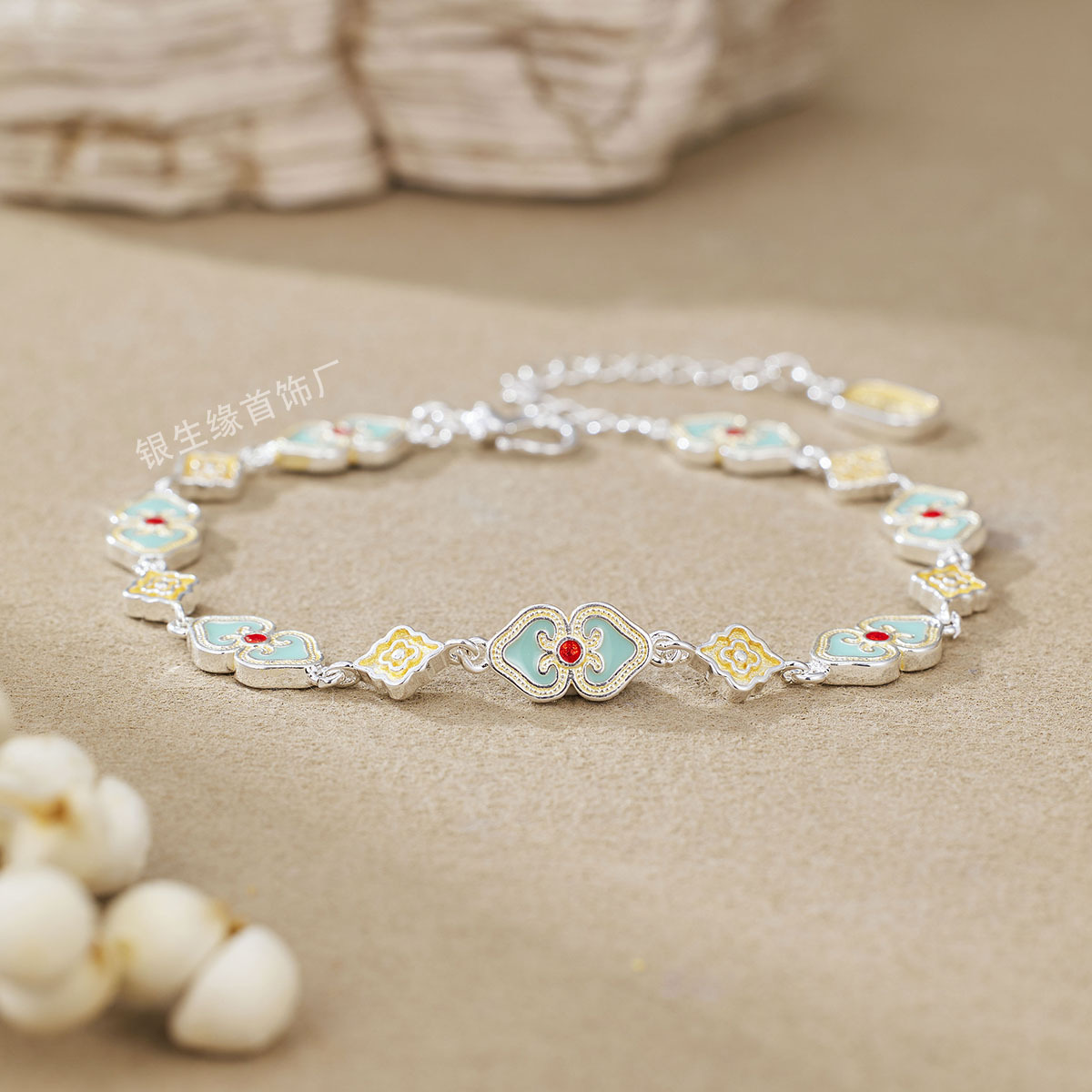 Tiktok-Style Gold-Painted Enamel Floral Poetry Rhyme Double Ruyi Bracelet for Women, Chinese Style Fashion Commuter Bracelet