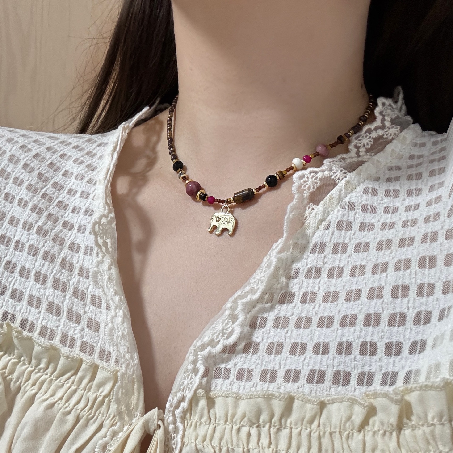 Dopamine Summer Retro Beautiful Broken Silver Gold Crystal Dream Island Elephant Necklace Natural Stone Alloy Beaded Animal