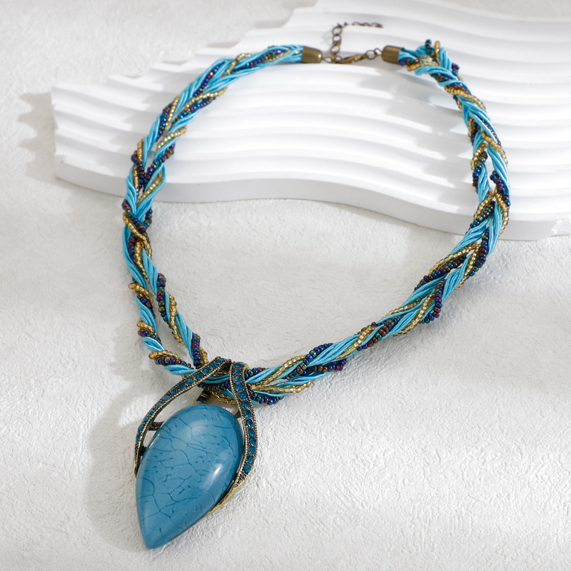 Cross-border Ethnic Style Necklace Female European and American Bohemian Vintage Gem Water Drop Pendant Necklace Rice Bead Woolen Chain
