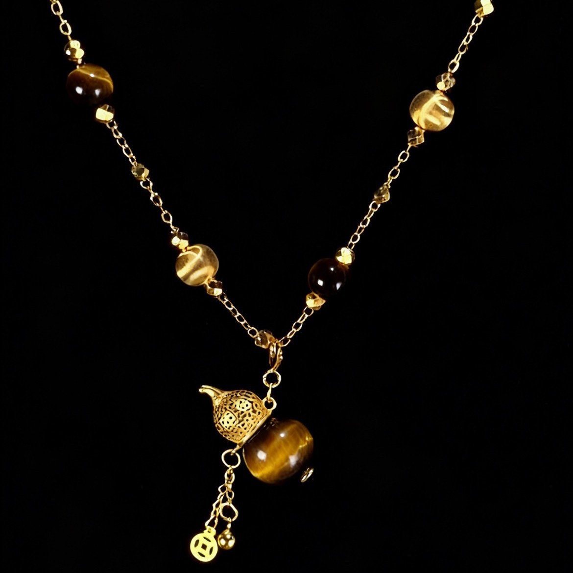 18K Real Gold Electroplated Tiger Eye Stone Beaded Gourd Necklace Accessible Luxury High-End Retro Fashion Versatile Niche Jewelry