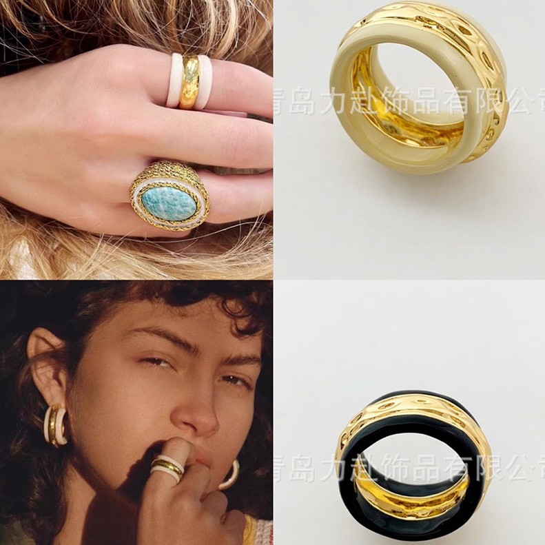 European and American Cross-border Metal Copper Gold Plated Enamel Glaze Ring Black Gold Contrast All-match high quality Ring