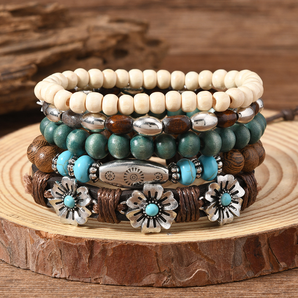 Hot Hot Bohemian Style Wooden Beads Stretch Bracelet Multi-layer Rose Set with Turquoise 5 Piece Set Wooden Beads Bracelet