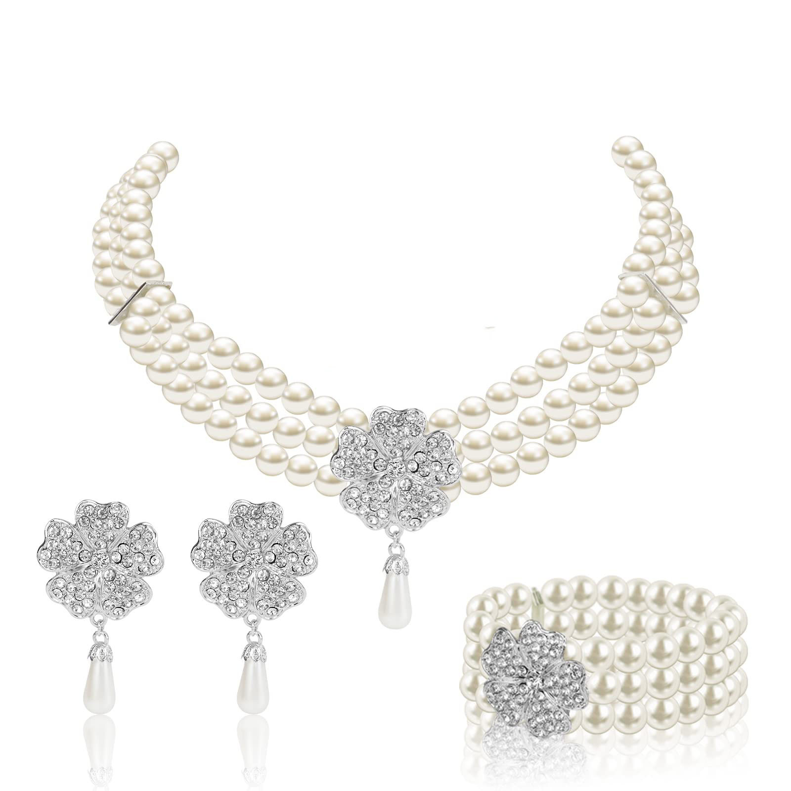 Cross-border supply of white pearl five-leaf clover necklace earrings bracelet three-piece bridal jewelry set Wholesale